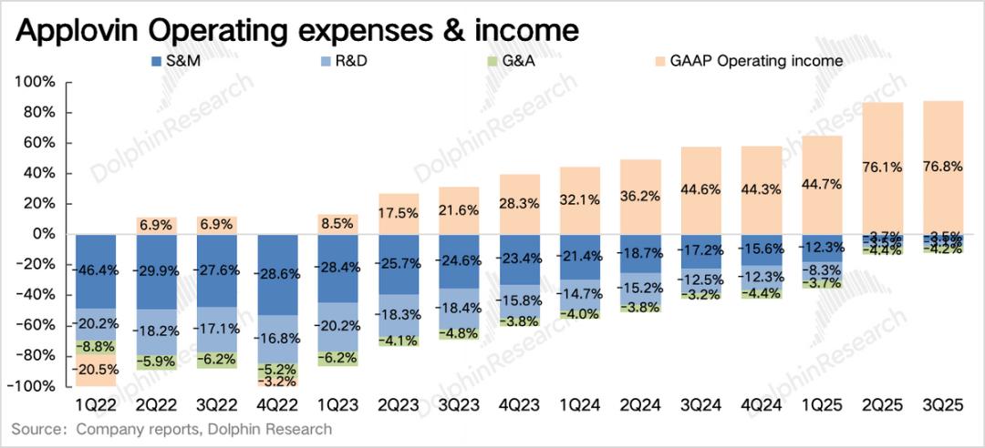 但三季度再次发挥纯广告中介的印钞机优势,经营利润率进一步提高到76.8%,EBITDA利润率更是环比提升了1.5pct。后续随着新平台的成本确认和新市场开拓投入,尤其是扩建销售团队的支出,进一步提高的空间相对较小。