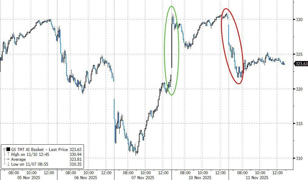 此外软银披露10月清仓英伟达。 “大空头”Michael Burry 质疑人工智能公司的资产负债。科技股估值担忧引发相关股大幅下挫,AI一篮子股票指数抹去了昨日的大部分涨幅。