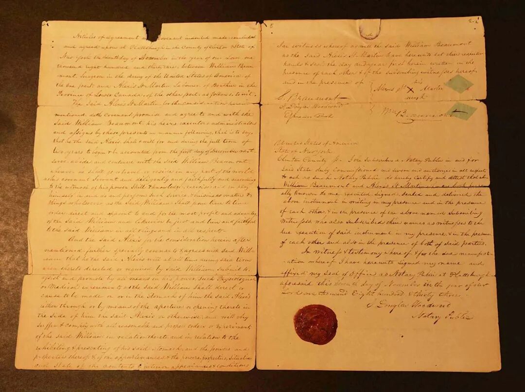 圣马丁与博蒙特签署的雇佣协议。虽然亲自画下了代表签名的符号,但后人普遍认为圣马丁并非完全出于自愿。| becker.wustl.edu