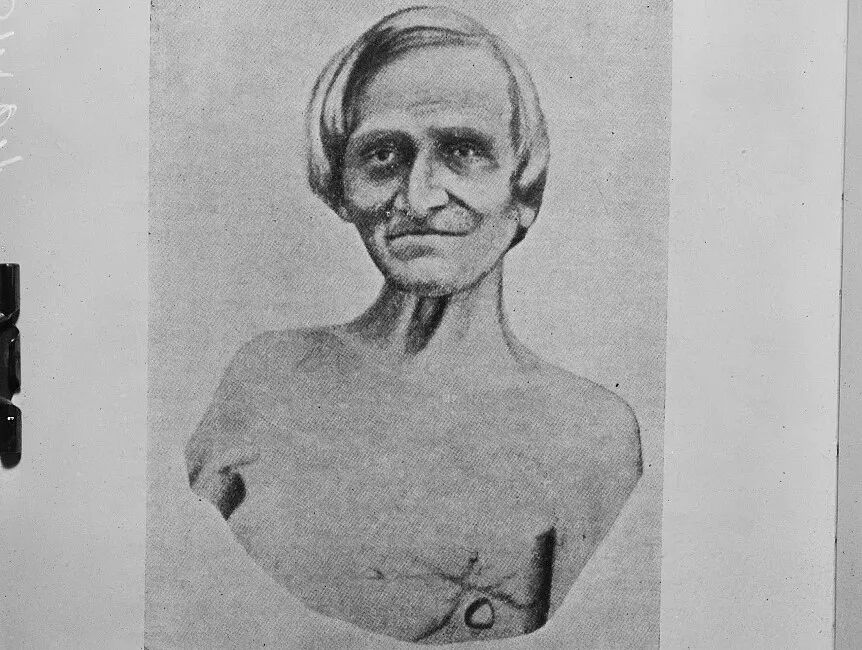 亚历克西斯·圣马丁的画像。图中标记了他左侧腹部瘘管的位置。这个无法彻底闭合的洞连通了他的胃部与外界。| smithsonianmag.com