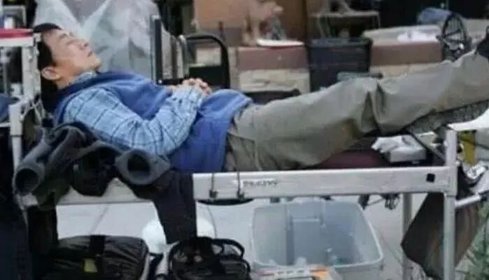 成龙在嘉禾片场有自己的休息室,因为他根本不回家。一个镜头拍完,他可能就在片场的躺椅上睡20分钟,然后被叫醒拍下一个镜头。