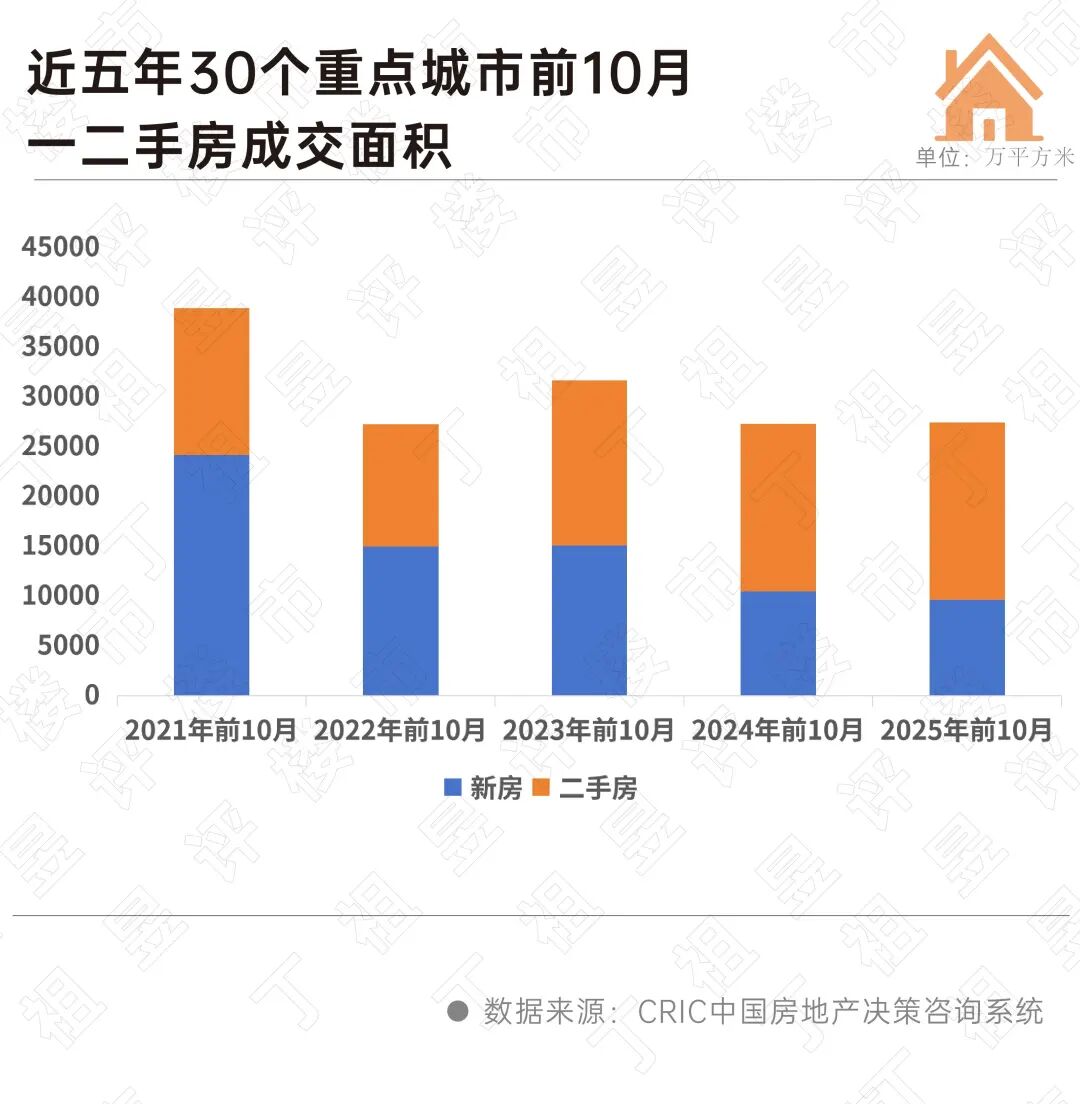 近五年来重点30城新房成交占比逐年下滑,至2025年前10月重点30城新房成交不足1亿平方米,同比下降7%,占一二手房成交总量的比重从2021年的六成以上降至不到四成。
