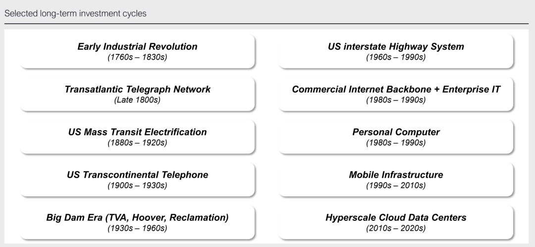 过去,很多跨十年甚至跨代际的投入,其共同点是把通用目的技术 (GPT, General-Purpose Tech) 变成基础设施,带来持续的生产率提升与新的产业网络。即使中间会夹杂阶段性过热或价格泡沫,但最终资产与能力沉淀了下来,成为长期发展的重要基础设施。如,早期的美国州际高速系统 (1960s–1990 s ) 投资,形成了全美统一物流与通勤网络,降低了交易成本,催生了连锁零售、新型供应链等形态,便利了人群在各州之间的流动和经济协作,成为美国经济发展繁荣的重要依托。