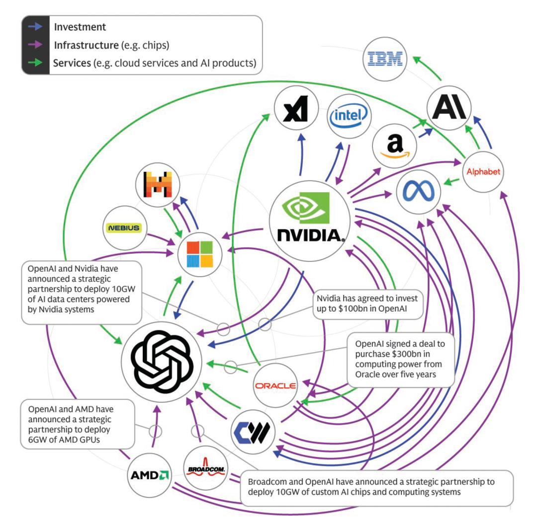 近期美国科技界纷纷推出重大投资计划,大举布局AI基础设施。其数万亿美金的投资和一些相互交叉持股的融资方式,引发全球热议。纽约时报10月撰文指出,“现在是时候宣告本世纪的第三次泡沫了——人工智能泡沫。大量投资者持续涌入,全然不顾其能产生多少收益以及何时产生收益。”