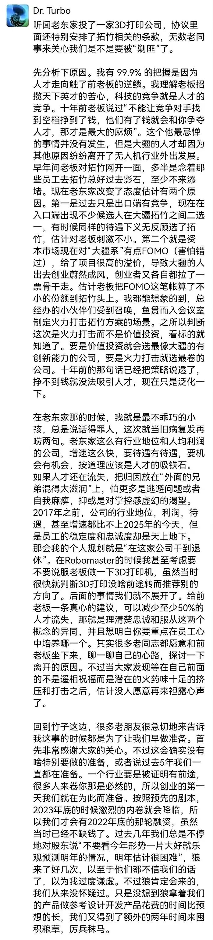 近期,拓竹创始人陶冶在朋友圈发表上千字长文,称「老东家投了一家 3D 打印公司,协议里面还特别安排了拓竹相关的条款」。究其原因,陶冶认为「有 99.9% 的把握是因为人才走向触了前老板的逆鳞」。