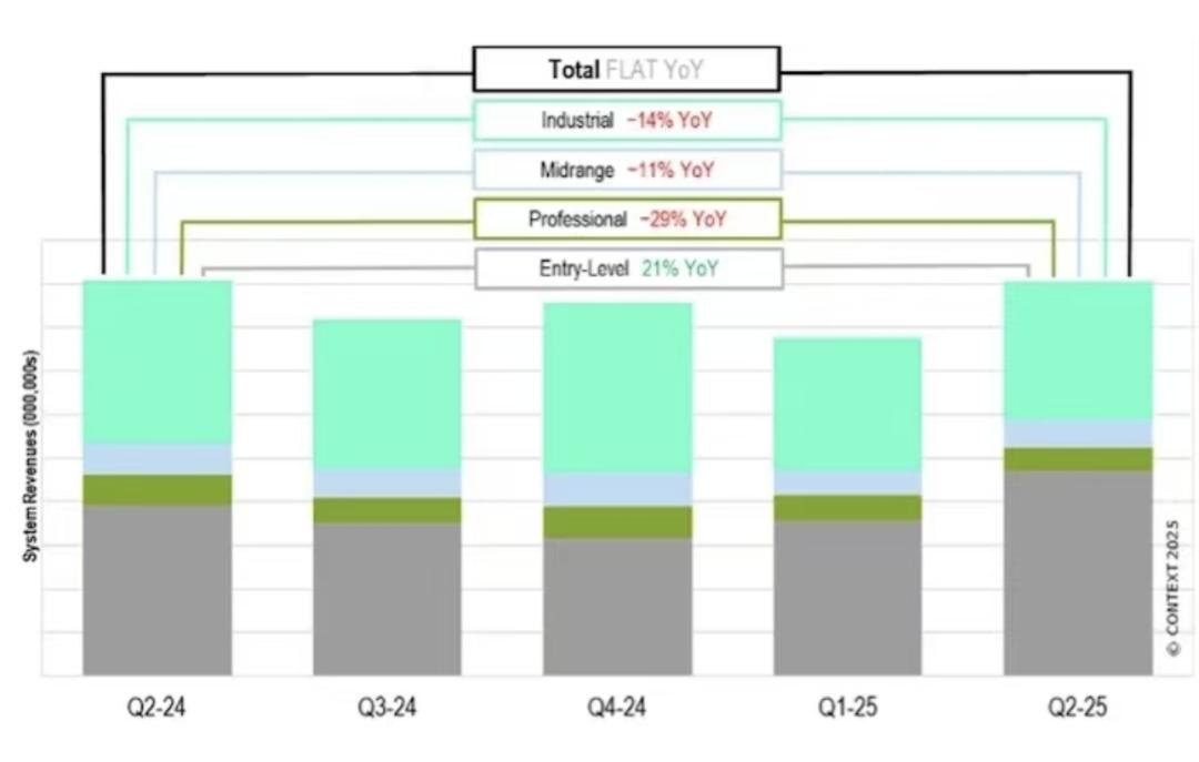 CONTEXT 发布的最新报告显示,2025 年第二季度,全球 3D 打印机四大品类市场中,只有入门级 3D 打印机市场实现了同比 21% 的正增长,专业级3D 打印机市场负增长 29%,中端 3D 打印机市场负增长 11%,工业级 3D 打印机负增长 14%。