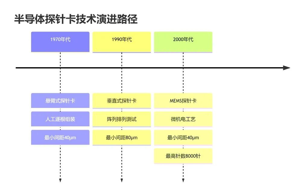 半导体探针卡作为晶圆测试的核心媒介,其技术发展始终遵循着摩尔定律的节奏,以满足芯片性能持续提升的测试需求。从历史演进视角来看,探针卡主要经历了从悬臂式、垂直式到MEMS微机电式三大技术阶段的跨越,每一次技术迭代都是为了解决前代技术在测试密度、频率响应和使用寿命方面的瓶颈。