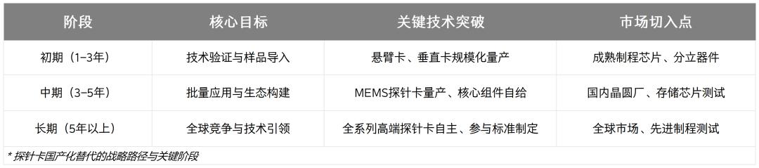 技术路线上,企业可遵循“由易到难”的渐进策略。优先聚焦成熟制程和特定芯片类型如MCU、CIS的垂直探针卡规模化量产,率先实现可靠交付与市场口碑积累。随着技术能力提升,逐步向更先进制程延伸。同时,瞄准未来技术趋势,集中研发资源在MEMS探针卡等前沿领域进行定点突破。MEMS探针卡已成为全球最大细分市场,是国内企业不能丢失的技术高地。