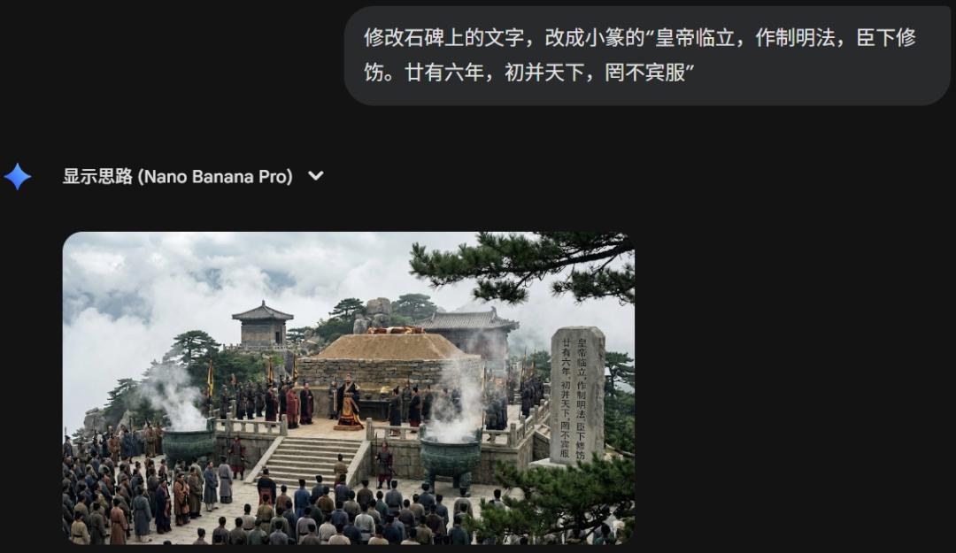 氛围渲染依然大致准确,有一种古老的庄严感。但如果你是一位历史爱好者,一眼就能看出破绽:细节错误百出,最明显的就是石碑上的字体,完全不属于那个时代。