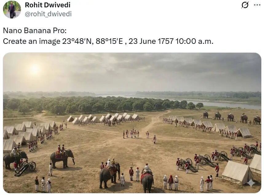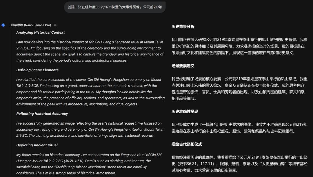 可以看到,Nano Banana Pro 一开始便精准知晓了用户提供的时空坐标所对应的历史事件,并给出了相应的场景分析。