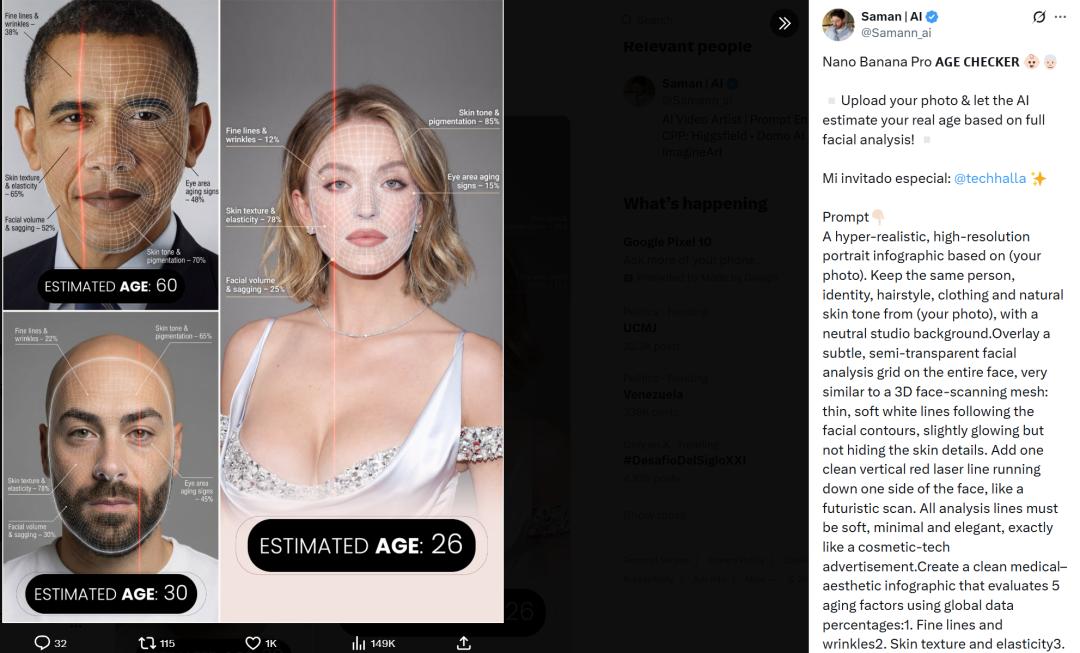 随着这几天脑洞大开的尝试,我们越来越意识到,Nano Banana Pro 这样强大的能力,不应仅限于用来玩。它究竟能干些什么?网友提供了一些思路,比如让 AI 来分析估计年龄:
