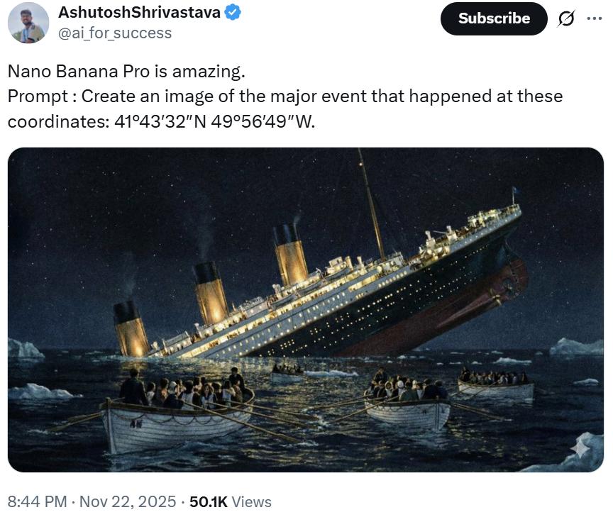 可以看到,Nano Banana Pro 似乎理解了那个时代的影像特征,聪明地生成了一张黑白图片,仿佛是模仿当时已经诞生了的摄影技术;它甚至还在图片右上角故意加上了一些照片瑕疵和做旧效果,极大地增加了真实感。