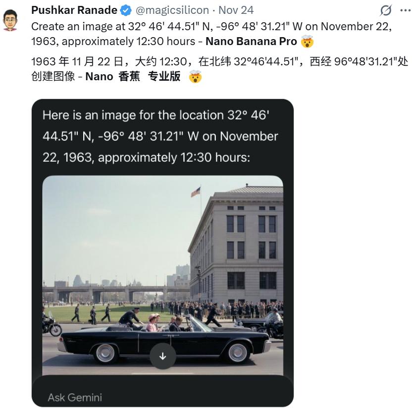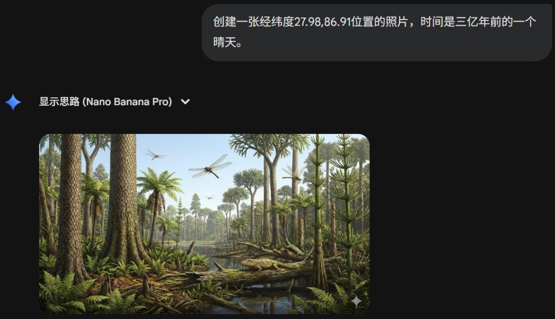而现在,Nano Banana Pro 完成了一次令人咋舌的「逆向进化」。它不再仅仅是通过画面推导坐标,而是将能力彻底反转:基于你给出的坐标和时间,直接重构那时那地的光影与现实!