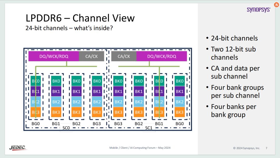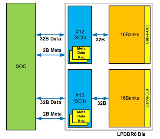 每个 LPDDR6 芯片包含两个子通道,单个子通道的位宽为 12 bit,而 LPDDR5 仅仅是 16bit 单通道的设计。