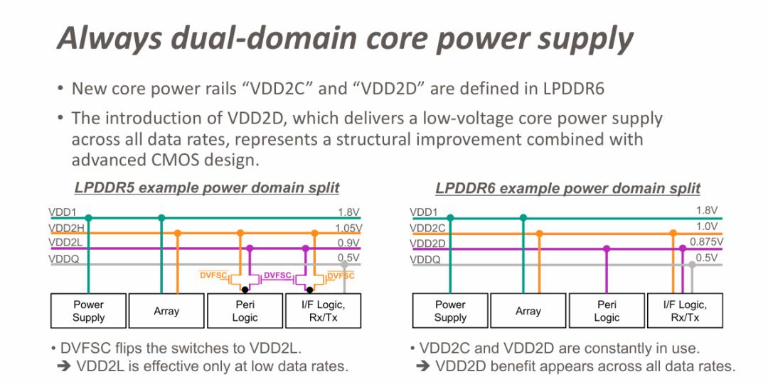 说人话就是,LPDDR 6 强制规定,将常规供电(VDD2C)与低功耗供电(VDD2D)分成了两条电源轨。在内存工作的高频段,使用稍高的电压保证性能,在空闲时切换到更低的电压,降低功耗。