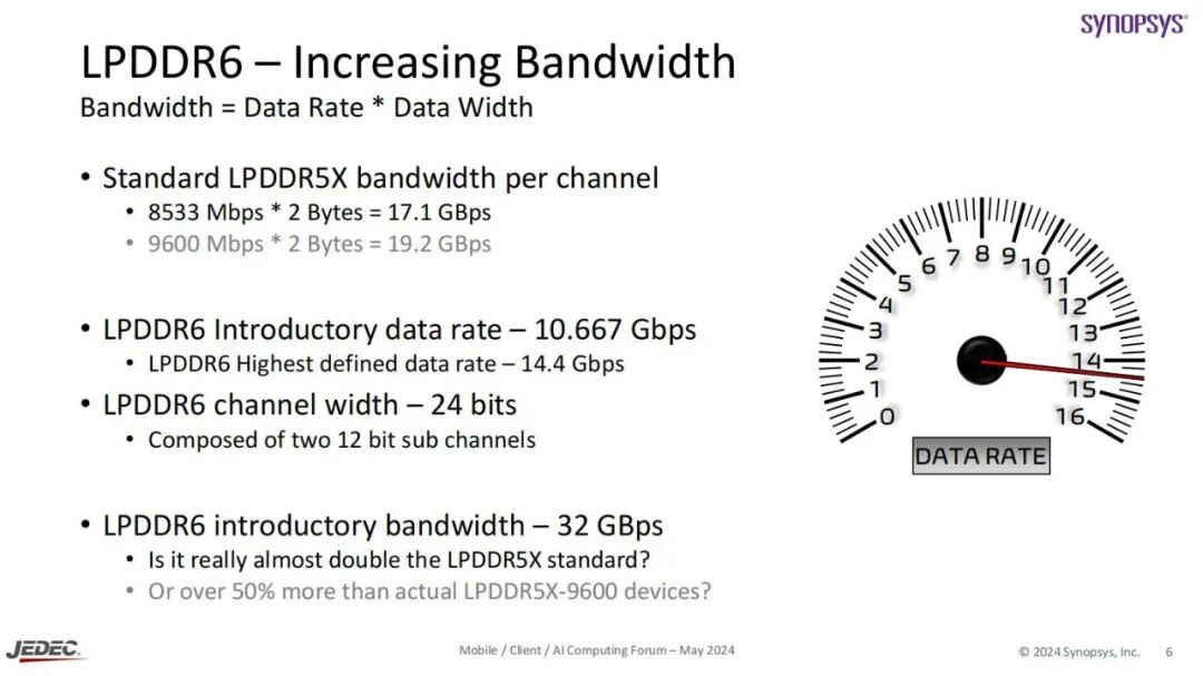 相较最初的 LPDDR5(6400MT/s),单颗 LPDDR6 理论带宽提升大约是 2.5–3.4 倍;对比目前速率最高的 LPDDR5X (10667MT/s),也有大约 1.5–2 倍的提升。