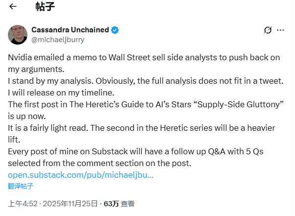 需要指出的是,尽管Burry此前被媒体误报持有“近10亿美元”的英伟达空单(实际上其名义价值仅为920万美元,且已平仓部分),但这并未改变他看空AI宏观逻辑的决心。
