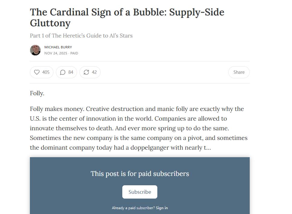 这一次,他并未如传言般通过巨额期权做空市场,而是选择通过首篇专栏文章《泡沫的主要迹象:供给侧的暴食》(The Cardinal Sign of a Bubble: Supply-Side Gluttony)来表达“做空AI”的观点。