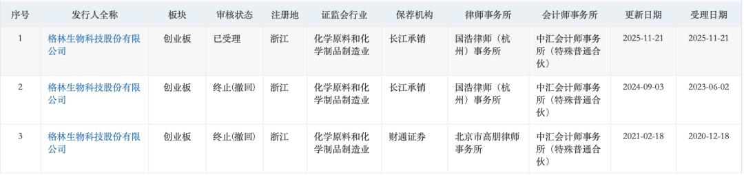 在第二次IPO终止审核一年多后,格林生物并未放弃,于2025年11月21日第三次提交创业板IPO申请并获受理,保荐机构为长江证券承销保荐有限公司。