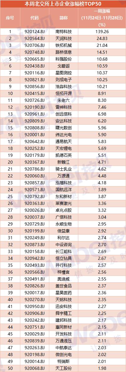 另外,路桥信息(920748.BJ)、科强股份(920665.BJ)、戈碧迦(920438.BJ)、星图测控(920116.BJ)、则成电子(920821.BJ)、浩淼科技(920856.BJ)、恒拓开源(920415.BJ)、朱老六(920726.BJ)、雷神科技(920190.BJ)、创远信科(920961.BJ)等16股周涨幅在5%-20%。