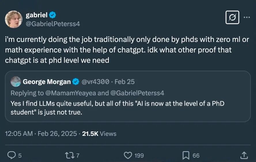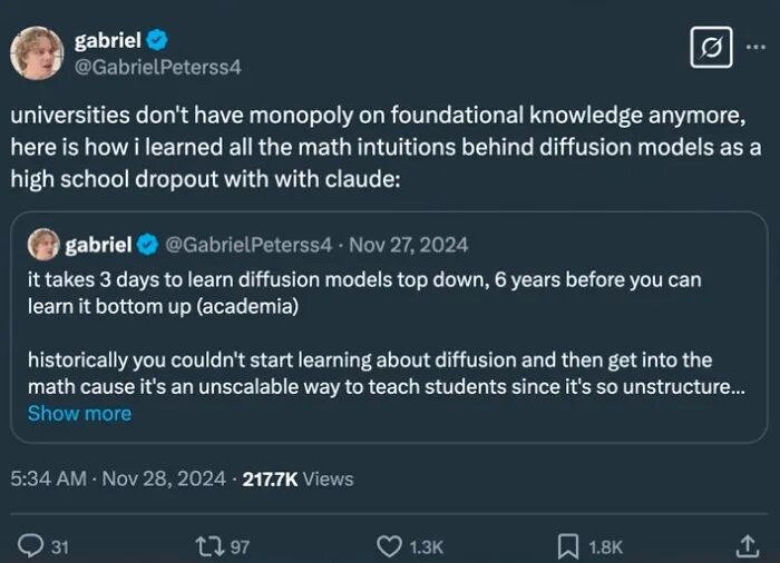 主持人:是啊,对于很多在体系里的人来说,这几乎是在动他们的根基:“我花了 10 年读书,背上了 40 万美元的学贷,好不容易把论文熬完拿到博士。现在你告诉我,有个叫 Gabriel Petersson 的高中辍学生,用 ChatGPT、在没有任何正式 ML 或数学训练的情况下,做着传统上只有博士才能做的工作?”