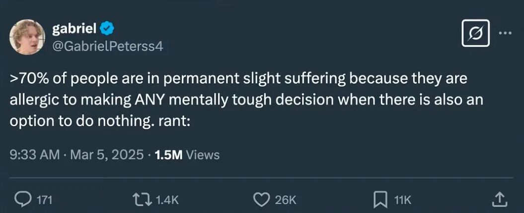 “世界上 70% 的人都处于一种长期的轻度痛苦状态,因为只要存在‘什么都不做’这个选项,他们就会对任何需要心理上用力的决定过敏。”