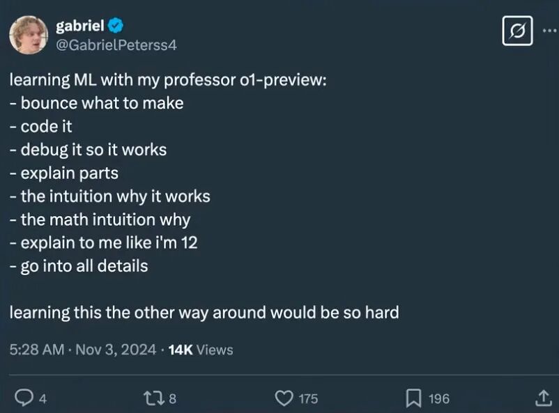 “跟我的教授 o1-preview 一起学机器学习:先定一个要做的东西。写代码。Debug,让它跑起来。让它解释每一步、解释背后的直觉。把主要直觉再用‘我 12 岁能听懂’的方式讲给我,并把所有细节都展开。如果反过来学,那会难到爆炸。”