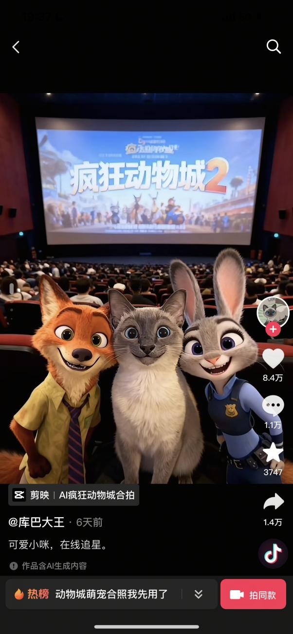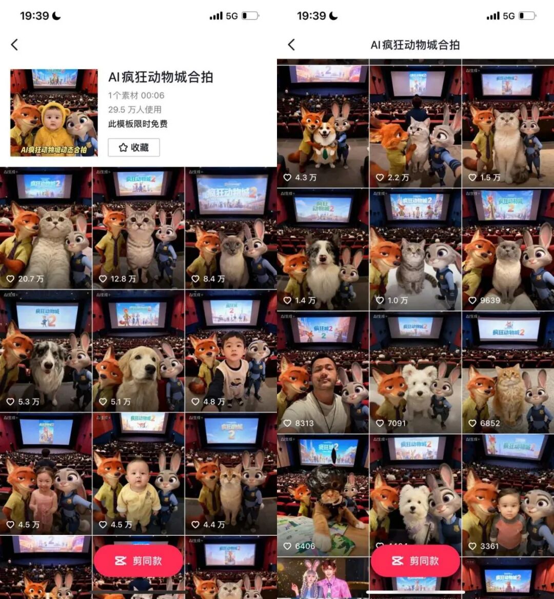 在抖音,和#疯狂动物城2AI合影#的相关话题播放量,接近4亿。