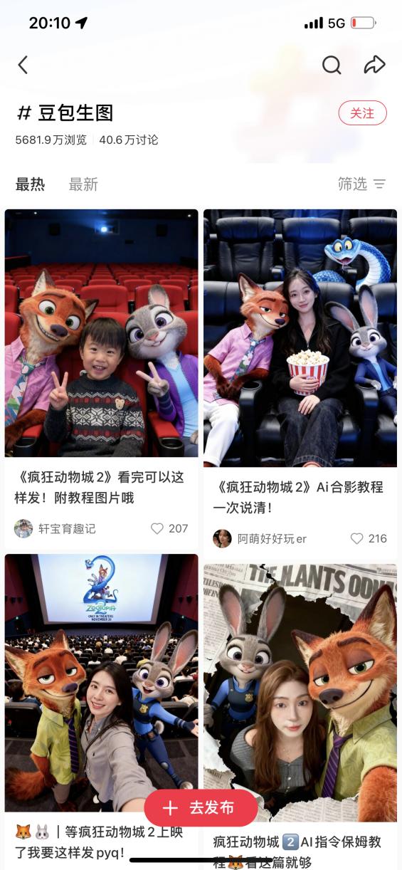 在#疯狂动物车2ai合影、#和朱迪尼克合影、#ai合影、#疯狂动物车 等多个话题,均有大量自拍配图,相关话题超过千万。