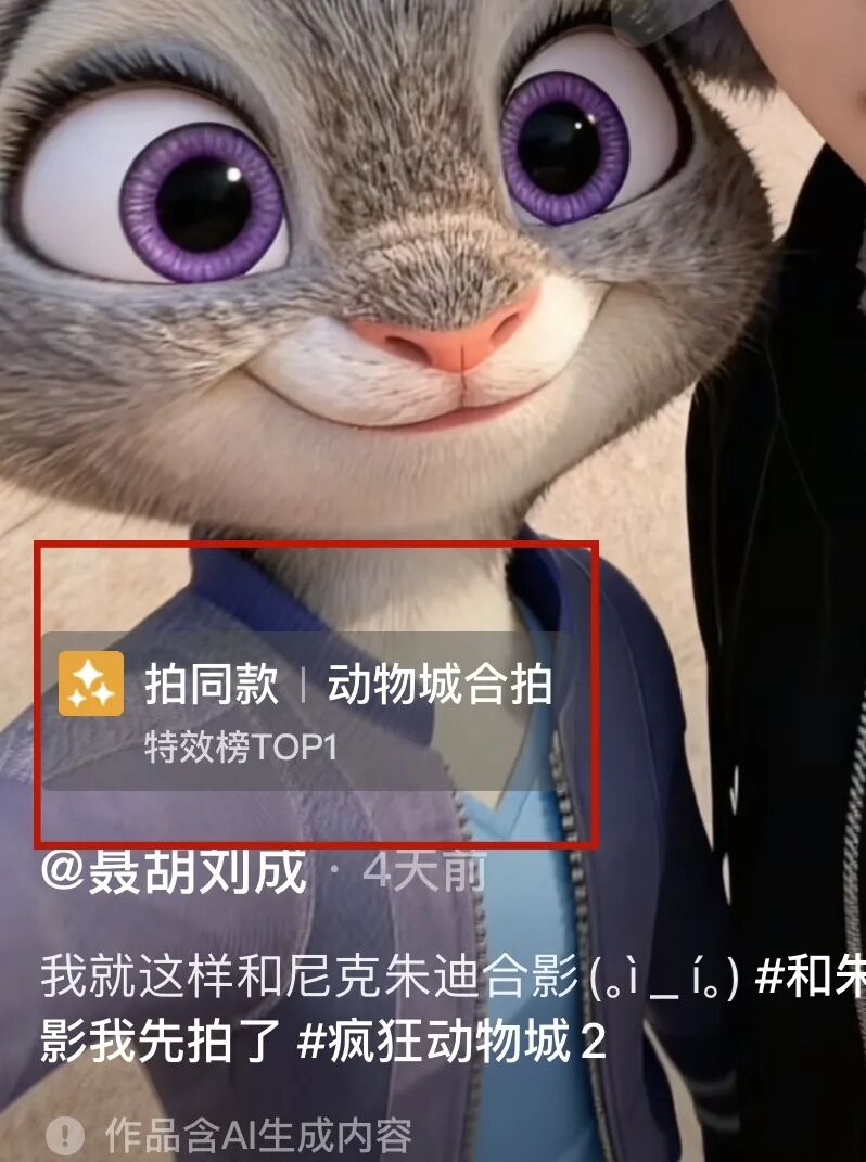 在抖音,出现一款叫做“动物城合拍”的AI特效!只要上传一张你的自拍照,就能自动生成一个和朱迪尼克合影照片为主的视频。