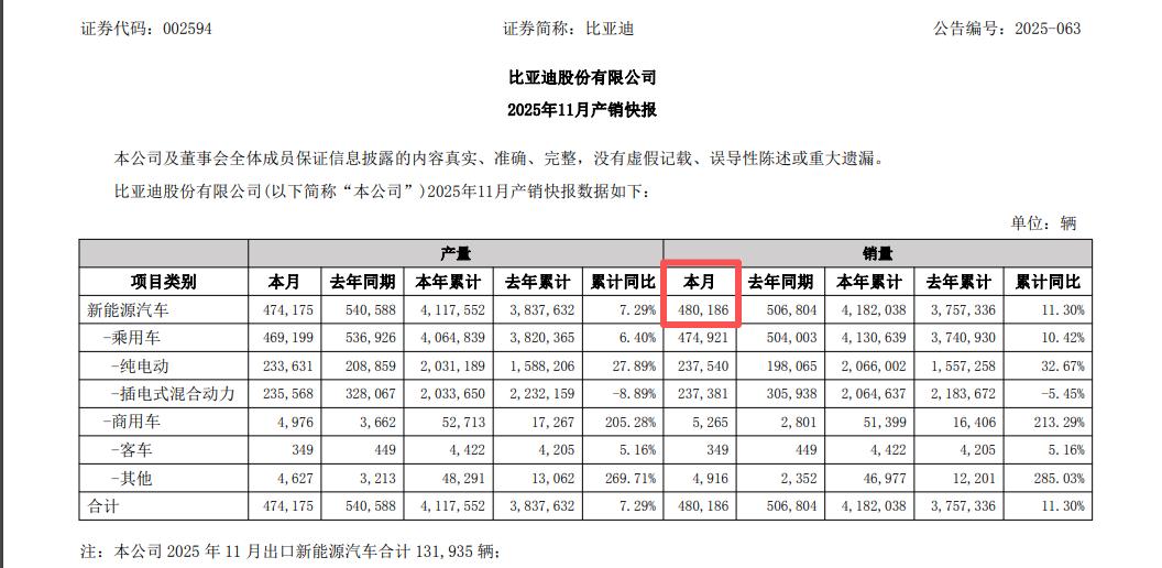 比亚迪2025年11月的销量达48.02万辆,仍未能突破月销50万辆的关口。