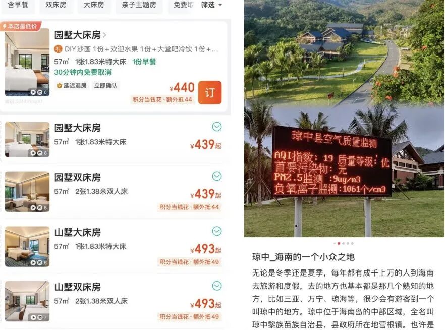由沿海向岛中内陆靠拢,来到陵水周边的琼中黎族苗族自治县,不到500元就能在豪华连锁酒店住出隐居热带雨林的效果——