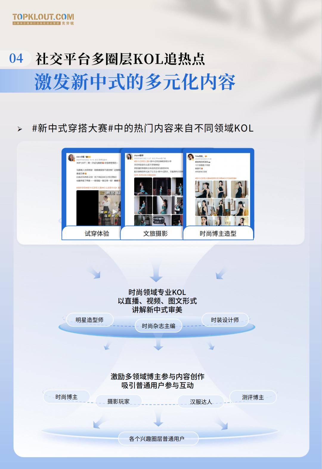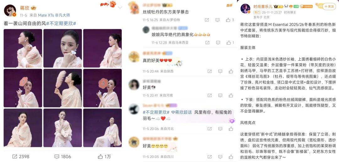 在明星热度以及#新中式穿搭大赛# 等热门话题的带动下,时尚杂志主编、明星造型师、时装设计师等不同领域的专业KOL,开始在社交媒体跟进解读。