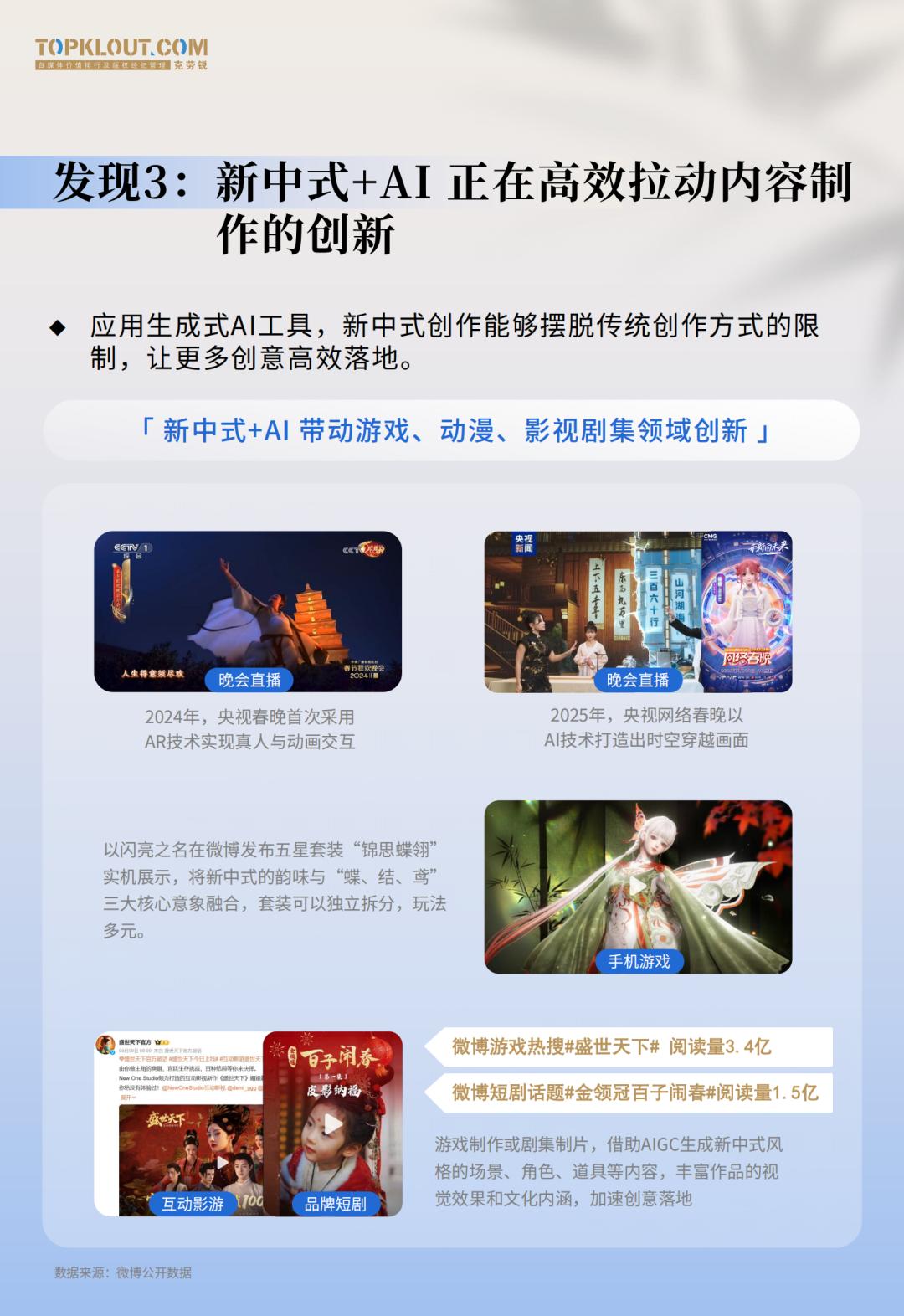 央视春晚采用AR技术实现真人与动画交互,运用AI技术打造“时空穿越”画面;手游《以闪亮之名》将新中式的韵味与“蝶、结、鸢”三大核心意象融合,发布五星套装“锦思蝶翎”;各类互动影游、品牌短剧借AIGC生成传统纹样、丰富视觉效果,既提升效率,又增强互动感。