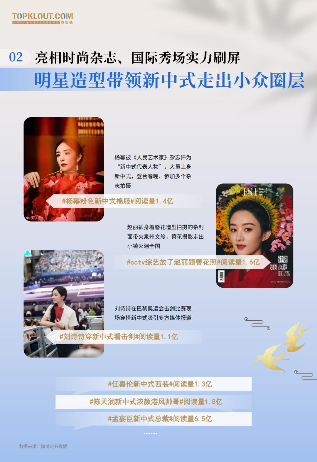 不管是#杨幂粉色新中式棉服#、#cctv综艺放了赵丽颖簪花照#,还是#刘诗诗穿新中式看击剑#,每一次明星与新中式的亮相,都被热搜放大,引发全民讨论。