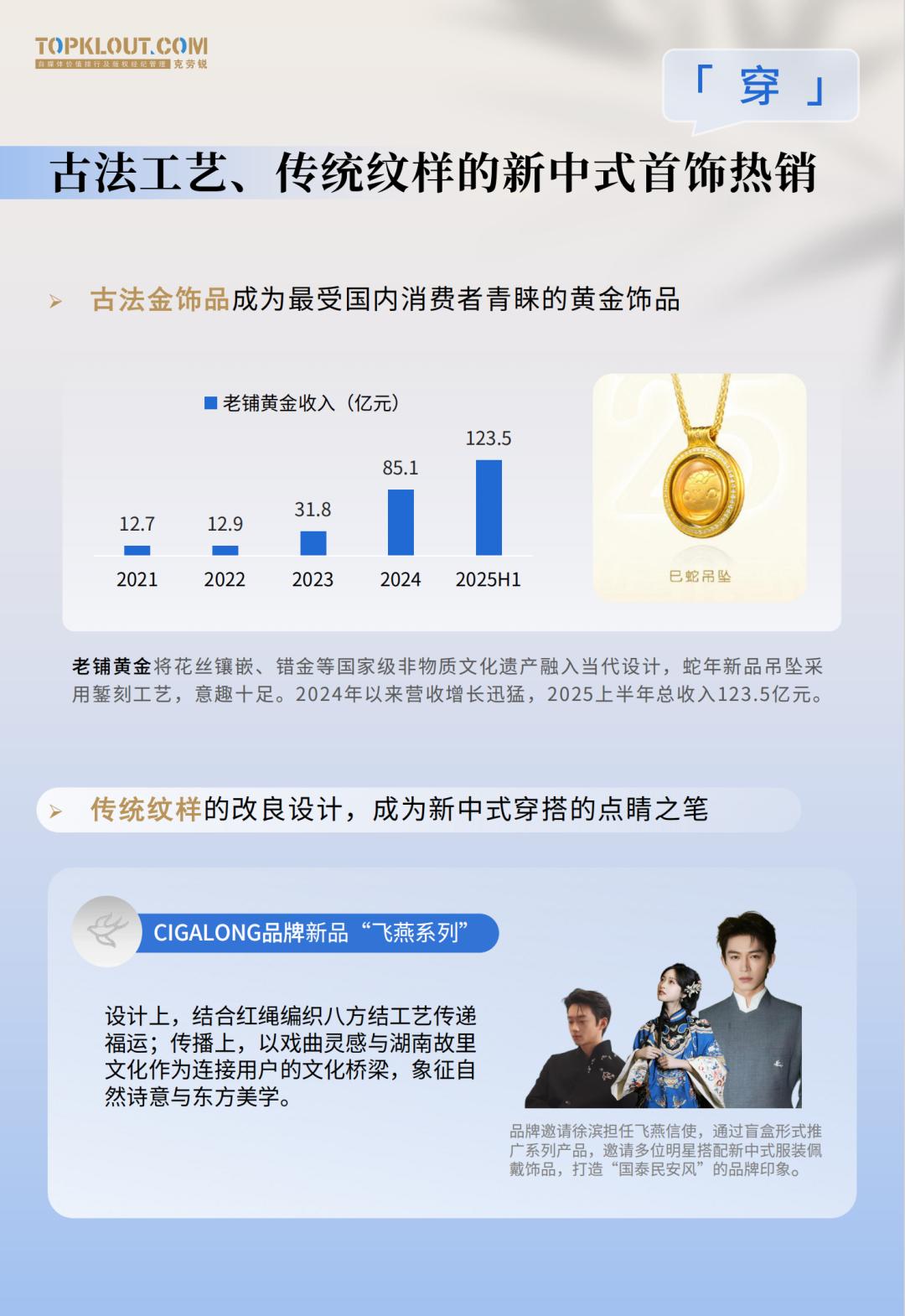 古法金饰热销,老铺黄金将花丝镶嵌、错金等非遗工艺融入现代设计,助品牌2025上半年营收高涨;CIGALONG的“飞燕系列”用红绳编织八方结,不仅传递福运,更让新中式设计成为穿搭的点睛之笔。