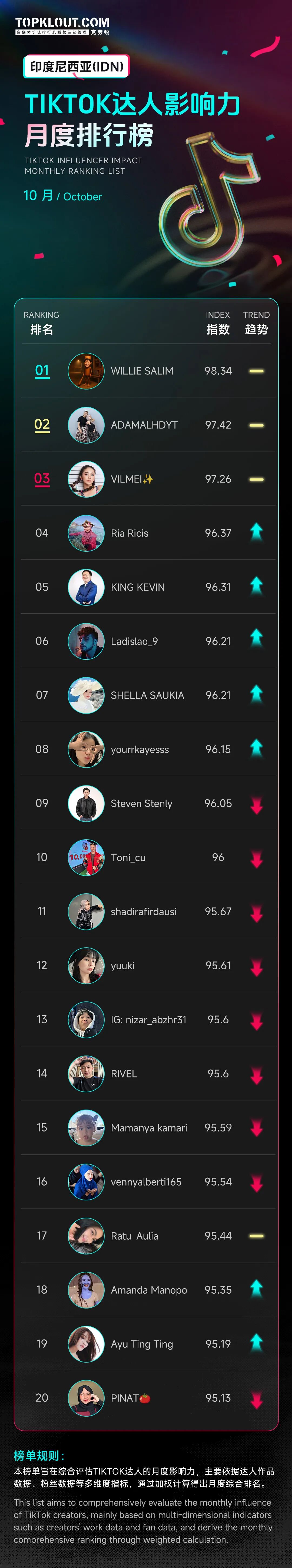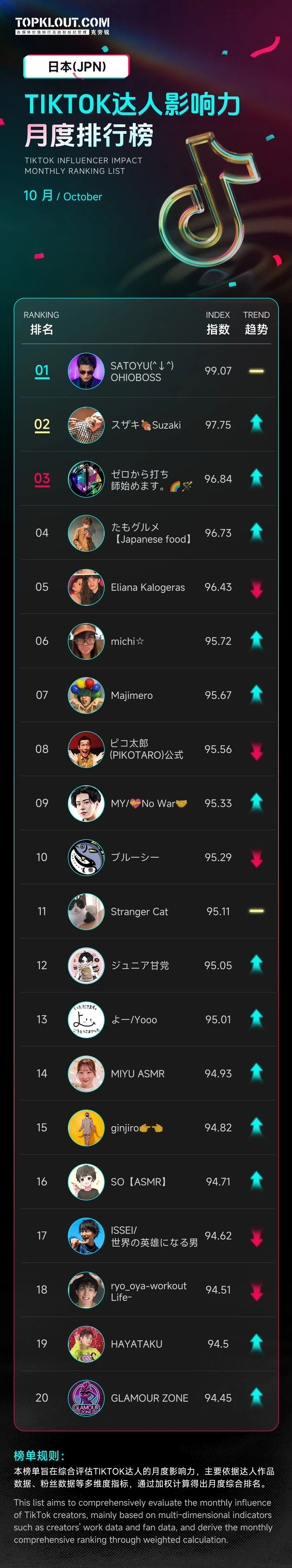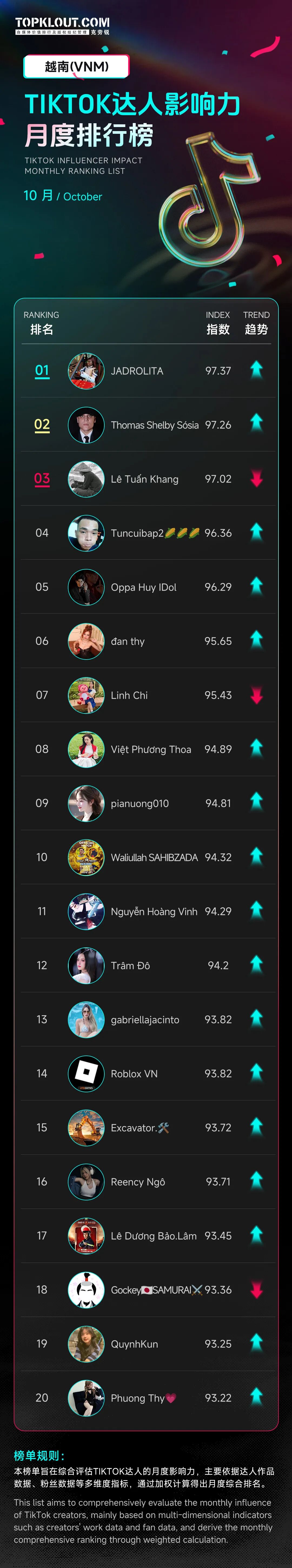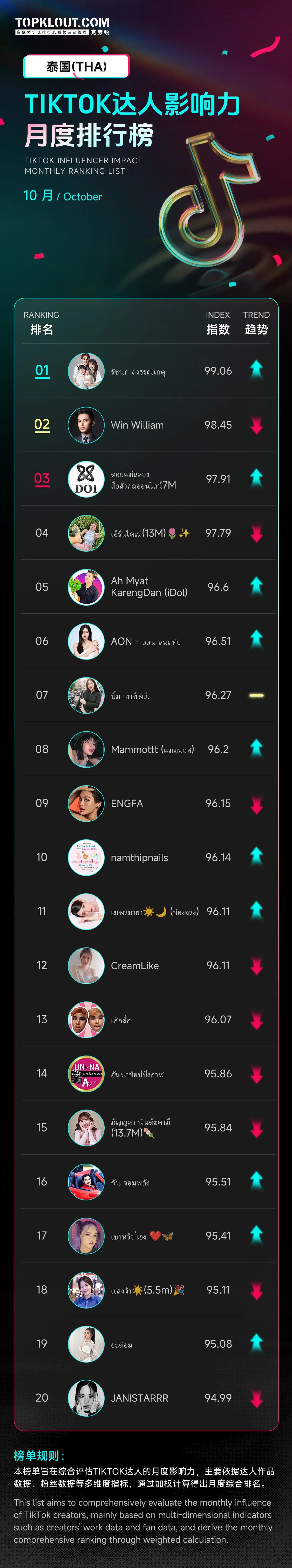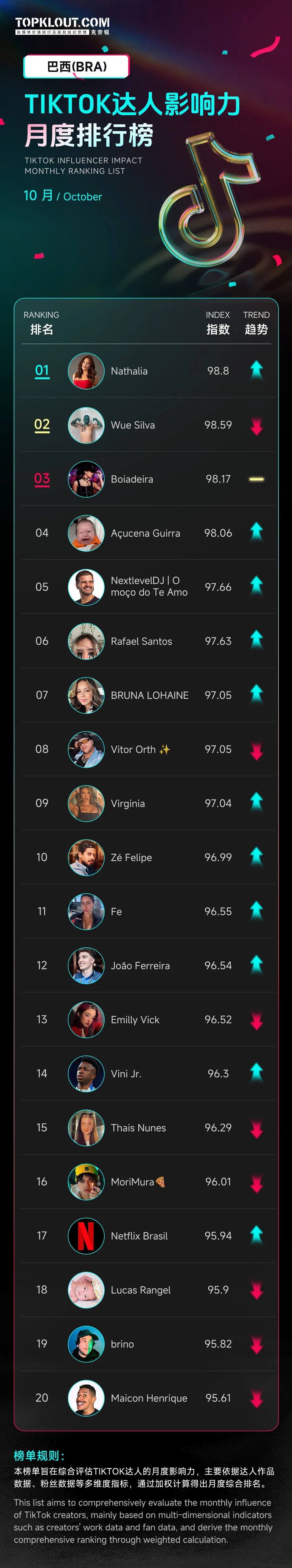 该榜单主要依据达人作品、粉丝数据等多维度指标,通过加权计算得出月度综合排名,评估美国、英国、日本、巴西、泰国、越南等十个国家TikTok达人的月度影响力。