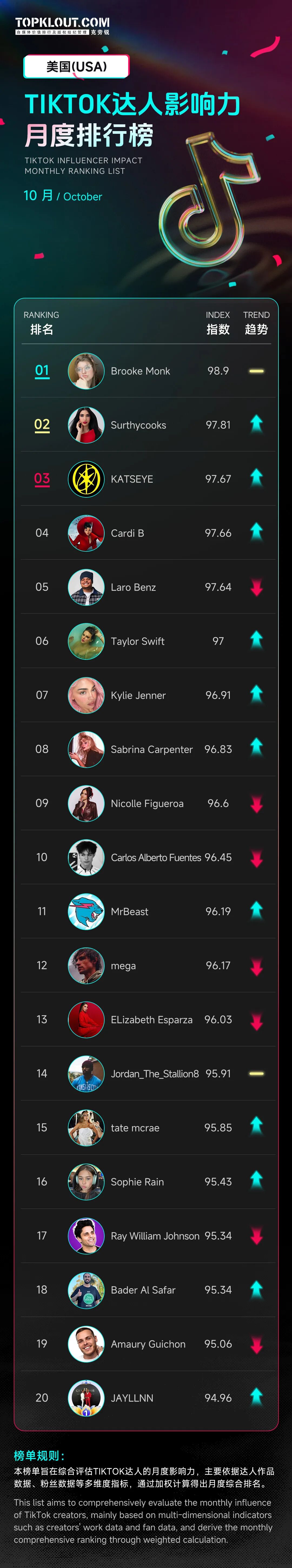 TikTok达人影响力10月榜:@Brooke Monk三连榜首,这十个国家哪些达人更红?