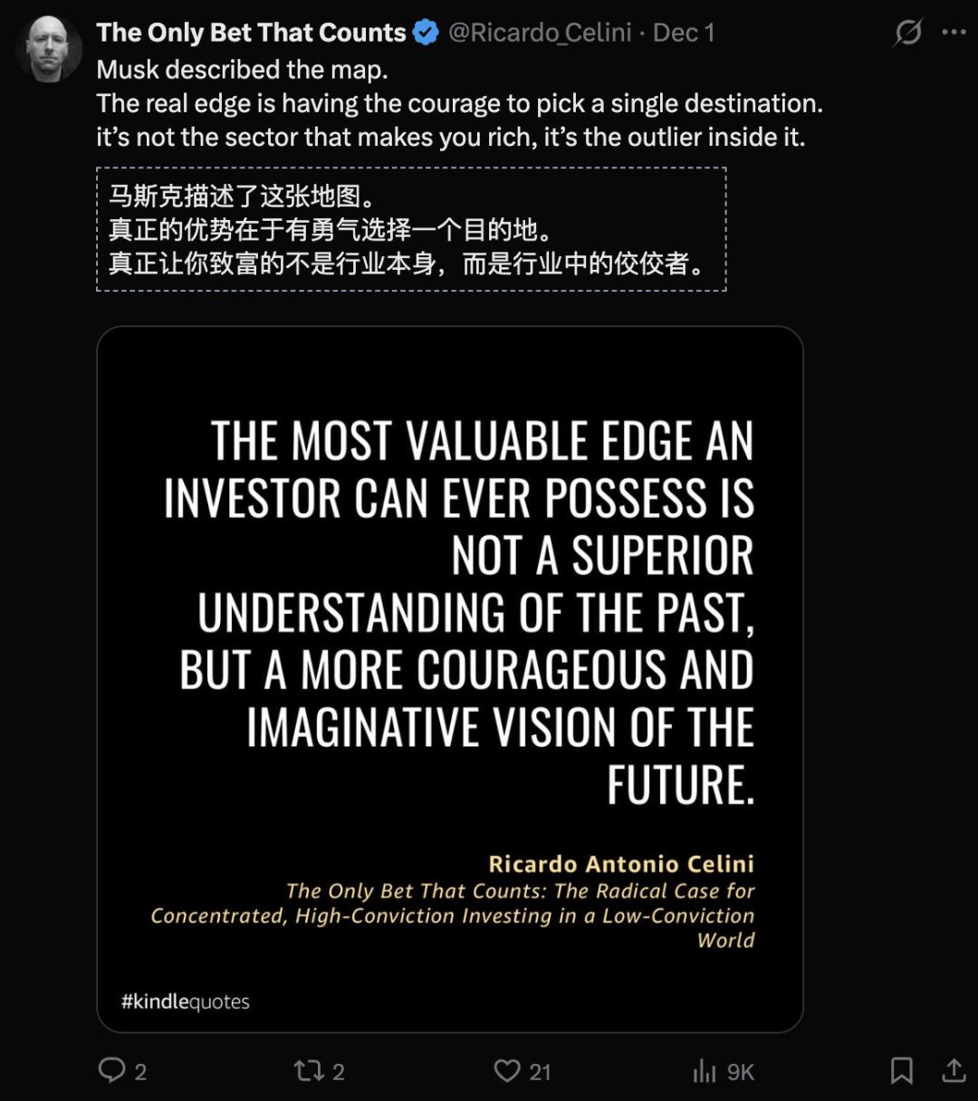 马斯克在投资未来,正如Ricardo Antonio Celini在《唯一值得下注的选择》所言: