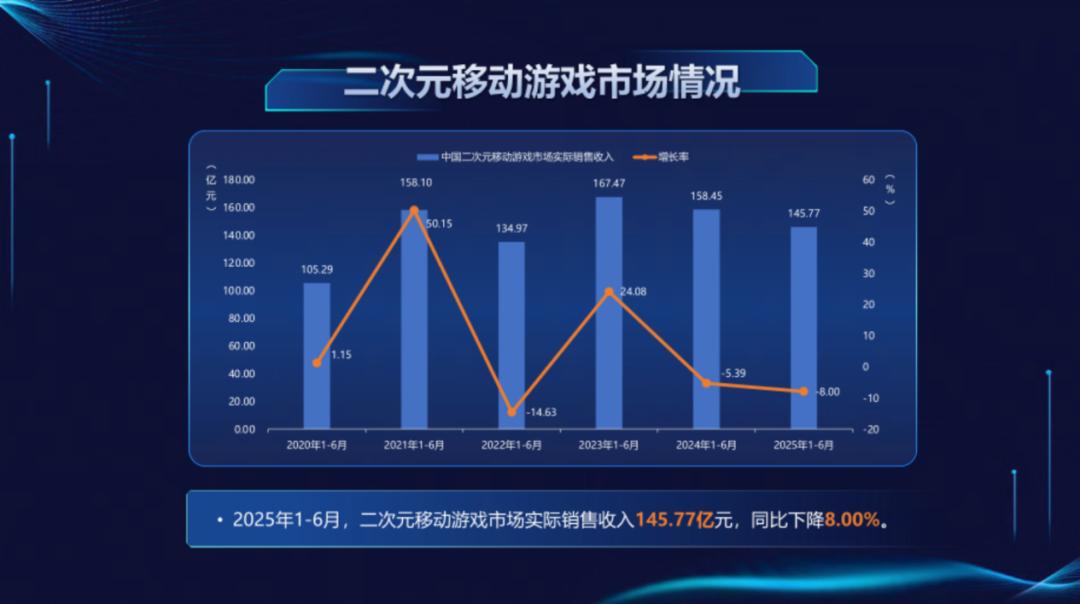据游戏工委《中国游戏产业报告》统计,在行业规模整体保持正增长的情况下,2025上半年二次元移动市场实际销售收入同比下降了8%。