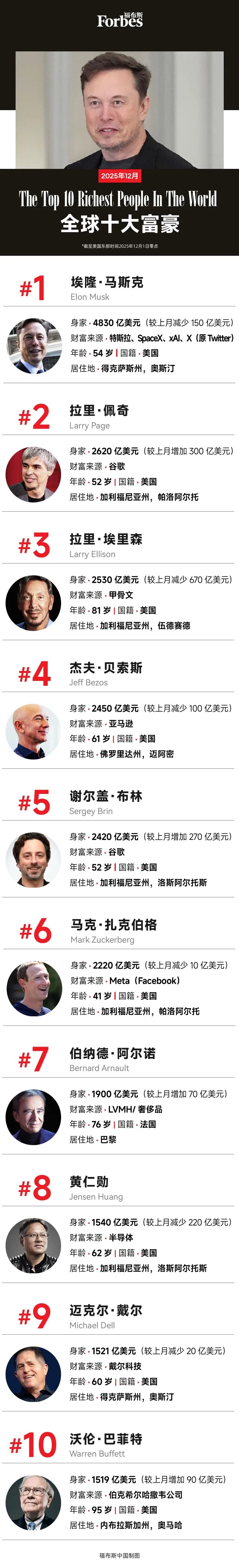 自1987年以来,《福布斯》持续追踪全球亿万富豪。2025年4月,我们的年度亿万富豪榜共统计了3028位亿万富豪。以下是据《福布斯》统计,截至美国东部时间2025年12月1日午夜12:00的全球十大富豪。他们的总身家合计为2.4万亿美元,与上月持平。(由于股价经常波动,他们的身家可能每天都在变化,《福布斯》另有实时亿万富豪榜追踪富豪们的每日财富变化。)