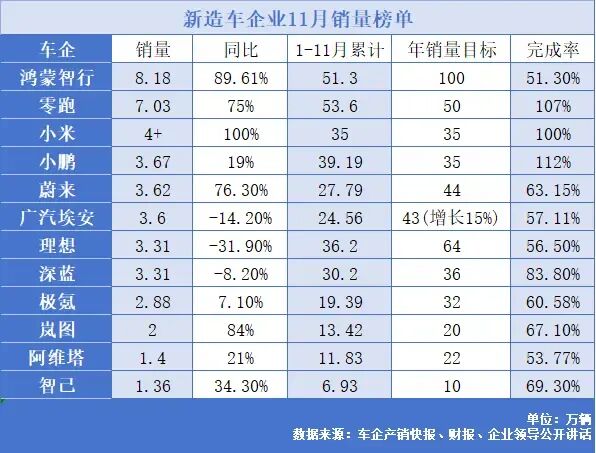 “跨界者”华为与小米的“红人”效应持续放射至规模,“五界”集合,鸿蒙智行11月销量攻破8万辆大关,稳居新造车企业头部位置,但远不及其年初交付量100万台的野心;小米月11月销量站上4万辆,提前完成全年目标的同时,累计销售已突破50万辆,成长迅速。