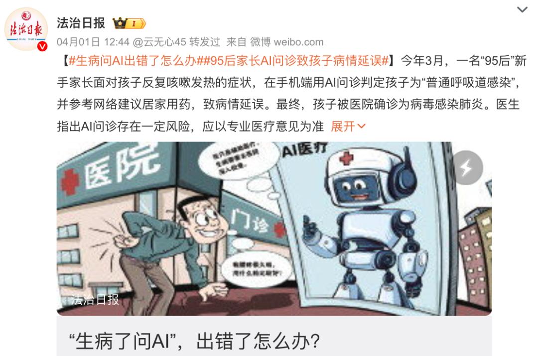法治日报报道AI问诊导致病情延误事例,并讨论AI医疗如何发展 | 微博@法治日报