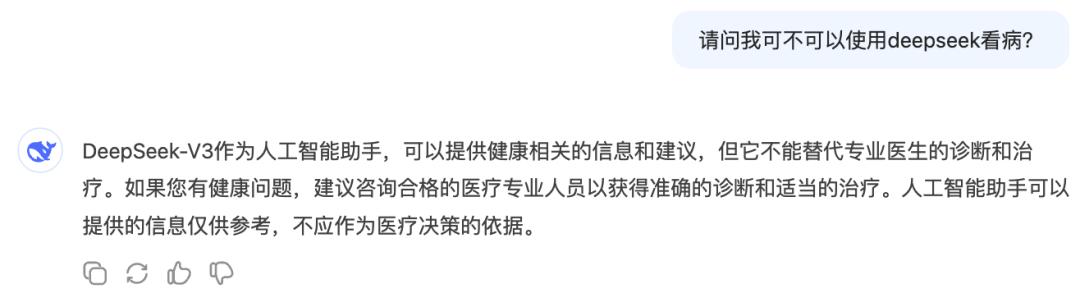 不花钱、不用抢号,还比医生耐心得多,是不是以后看病找DeepSeek就行?如果问DeepSeek本人,它会回答: