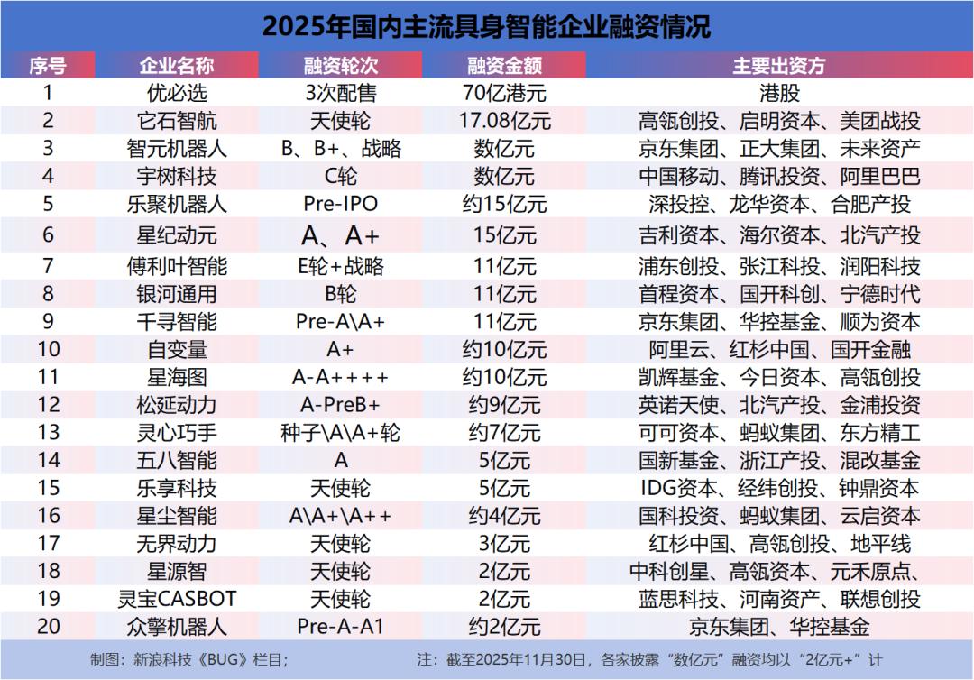 另据《BUG》栏目统计,截至今年11月30日,国内已披露获得融资且有相关机器产品的企业,仅前20家的累计融资额已达到206亿元。其中包括:优必选年内3次配售累计获得70亿港元(约63.574亿元)融资;它石智航年内两次天使轮累计获得约17.08亿元融资;以及乐聚机器人、星纪动元、银河通用等企业年内多次融资获得的超10亿元融资等。