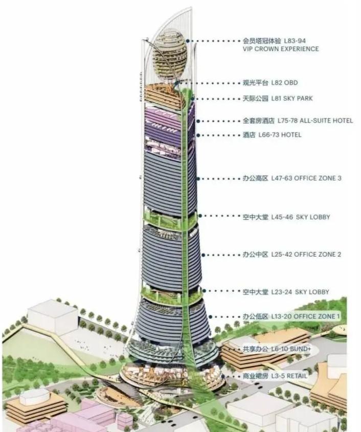 其700米高度的早期方案(后调整为668米)一度瞄准“中国第一高楼”宝座,试图超越632米的上海中心大厦。