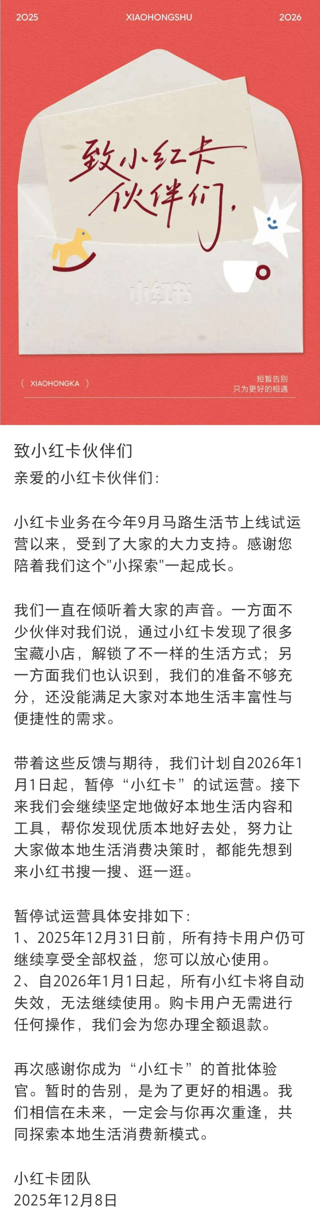 上线不足百天,小红书本地生活会员产品“小红卡”宣布暂停试运营。
