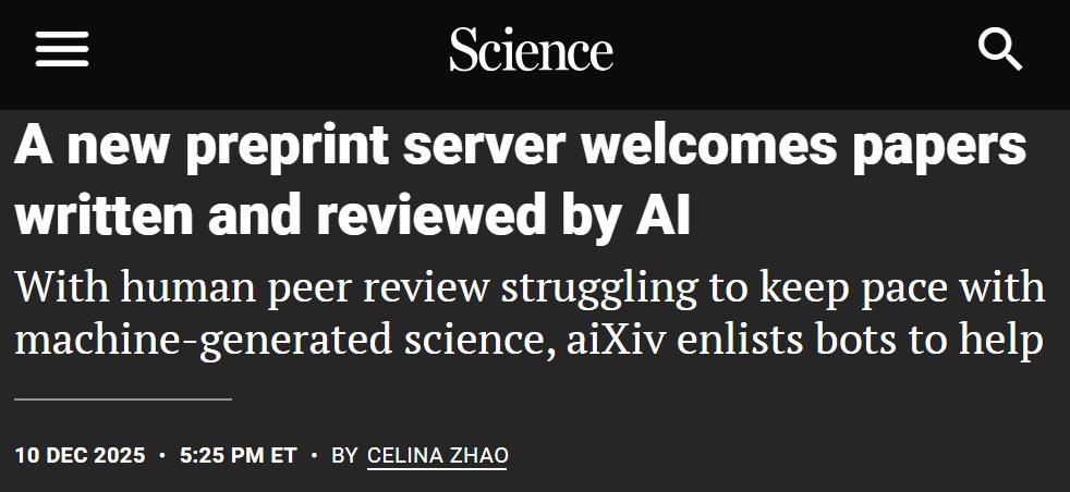 arXiv前不久宣布不再接收纯AI撰写的综述文章,除非已经在期刊或会议通过同行评审;Science等顶刊依然对AI署名严防死守。