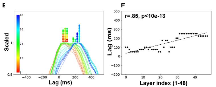 GPT的48层在大脑语言通路中呈现出清晰的「时间—深度」对应结构。浅层(暖色)在更早的时间点达到峰值,深层(冷色)在更晚时间出现。TP、aSTG、IFG等高阶区域表现出强线性关系(r=.93 / .92 / .85),而mSTG(近听觉皮层)几乎没有层级结构(r≈0)。