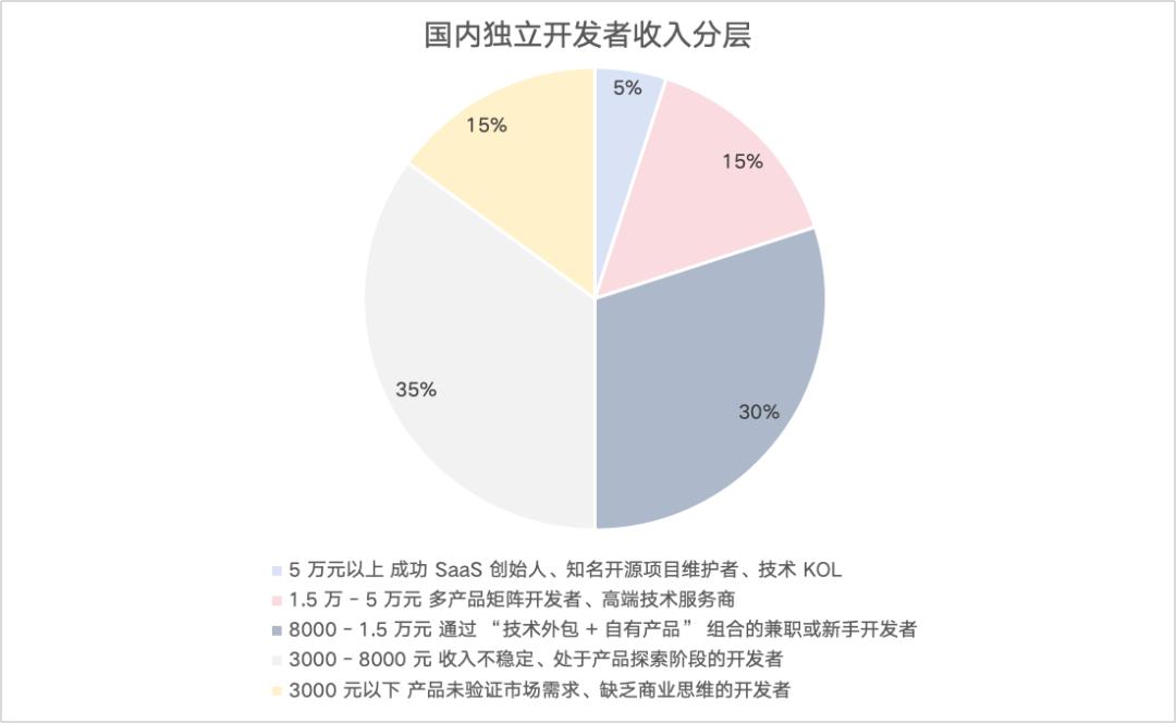 这组数据揭示了一个事实:仅约20% 的独立开发者能达到或超过一线城市相对稳定的薪资水平,而超过半数的开发者仍在温饱与波动中徘徊。